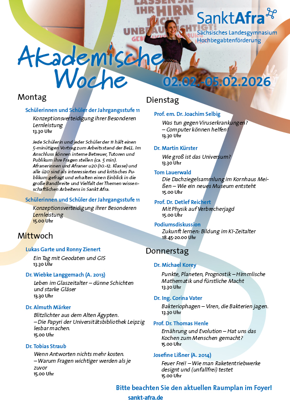 Zahlreich sind die Angebote, mit denen uns in der ersten Februarwoche Experten einen Einblick in ihr Fachgebiet und uns somit einen Ausblick von Sankt Afra hinaus in die Welt der Wissenschaften geben werden.