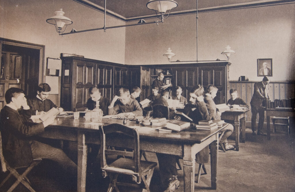 1876-79 wird ein neues Schulgebäude nach state of the art im neoklassizistischen Stil gebaut. Das ist das Haus, in dem wir heute noch lernen, mit ein paar kleinen Unterschieden in der Nutzung: Damals gab es dann auch Bäder im Schulgebäude, einen Betsaal, sogenannte Studierstuben, ein Tanz- und »Gesangslokal« und im Keller eine Kegelbahn. Was heute Bibliothek ist, war damals Speisesaal, dessen Essensausgabe die Schüler liebevoll »Graupenloch« nannten. Außerdem wohnte der Rektor in der Schule und auch der Schlafsaal der Schüler war im Gebäude untergebracht. Vor der Tür ein stattlicher Garten, die heutige Festwiese. Am Ostflügel wird die Inschrift »Christo Patriae Studiis« angebracht, »Für Christus, Vaterland und Wissenschaft«. – Wie würdest du es übersetzen?