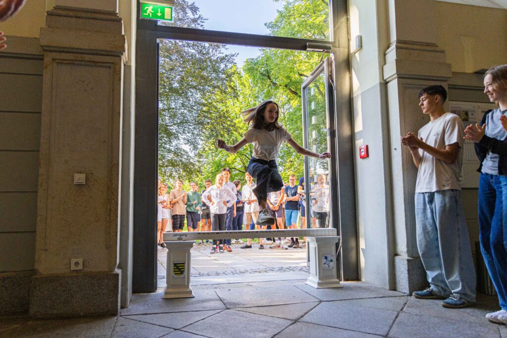 1876-79 wird ein neues Schulgebäude nach state of the art im neoklassizistischen Stil gebaut. Das ist das Haus, in dem wir heute noch lernen, mit ein paar kleinen Unterschieden in der Nutzung: Damals gab es dann auch Bäder im Schulgebäude, einen Betsaal, sogenannte Studierstuben, ein Tanz- und »Gesangslokal« und im Keller eine Kegelbahn. Was heute Bibliothek ist, war damals Speisesaal, dessen Essensausgabe die Schüler liebevoll »Graupenloch« nannten. Außerdem wohnte der Rektor in der Schule und auch der Schlafsaal der Schüler war im Gebäude untergebracht. Vor der Tür ein stattlicher Garten, die heutige Festwiese. Am Ostflügel wird die Inschrift »Christo Patriae Studiis« angebracht, »Für Christus, Vaterland und Wissenschaft«. – Wie würdest du es übersetzen?