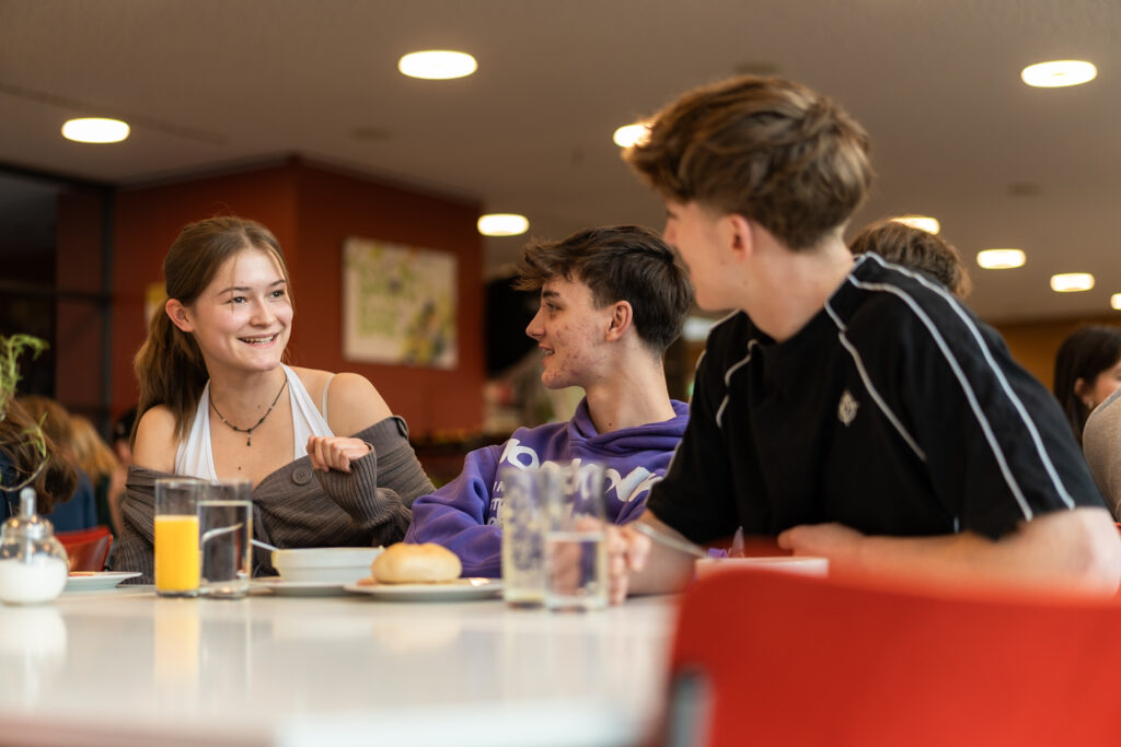 Komm mit, hier sind unsere Wege. Die kleine blaue Brücke führt dich vom Schulgebäude aus den Hang hinauf in unser Dorf. Dort geht’s die Stufen hinab zur Mensa, du siehst die weißen, sechseckigen Tische, Kräutertöpfe, Obstkörbe, die Salatbar. Wenn du willst, kannst du fünfmal am Tag essen und am Abend noch Snacks in der Cafeteria beim Quatschen und Billardspielen genießen. Geh mal vorbei auf die Terrasse, Blick ins Tal, die Sonne im Blick.