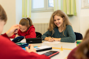 Komm mit, hier sind unsere Wege. Die kleine blaue Brücke führt dich vom Schulgebäude aus den Hang hinauf in unser Dorf. Dort geht’s die Stufen hinab zur Mensa, du siehst die weißen, sechseckigen Tische, Kräutertöpfe, Obstkörbe, die Salatbar. Wenn du willst, kannst du fünfmal am Tag essen und am Abend noch Snacks in der Cafeteria beim Quatschen und Billardspielen genießen. Geh mal vorbei auf die Terrasse, Blick ins Tal, die Sonne im Blick.